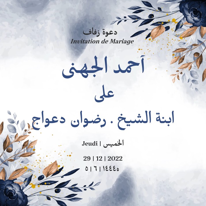 دعوة زفاف Invitation de Mariage السلام عليكم ورحمة الله وبركاته إنَّ الأفراح لا تكتمل الَّا بوجودكم نتشرف بدعوتكم لحضور حفل زفاف Assalamu’alaikum Warahmatullahi Wabarakaatuh La joie ne serait être présente sans votre presence ainsi nous avons l’honneur de vous inviter au mariage de أحمد الجهنى على ابنة الشيخ . رضوان دعواج Jeudi | الخميس 29 […]