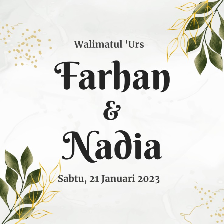 Walimatul ‘Urs Farhan & Nadia Sabtu, 21 Januari 2023 Assalāmu‘alaikum wa raḥmatullāhi wa barakātuh. Segala puji bagi Allah yang telah menciptakan mahkluk-Nya berpasang-pasangan. Kami bermaksud mengundang bapak/ibu/saudara/i dalam acara pernikahan kami: Ahmad Farhan Putra kedua dari Bapak Busyra Abu Bakar dan Ibu Yusriati & Nadiatul Hikmah Putri kelima dari Bapak Saifuddin (Alm) dan Ibu Mardisah Sabtu […]